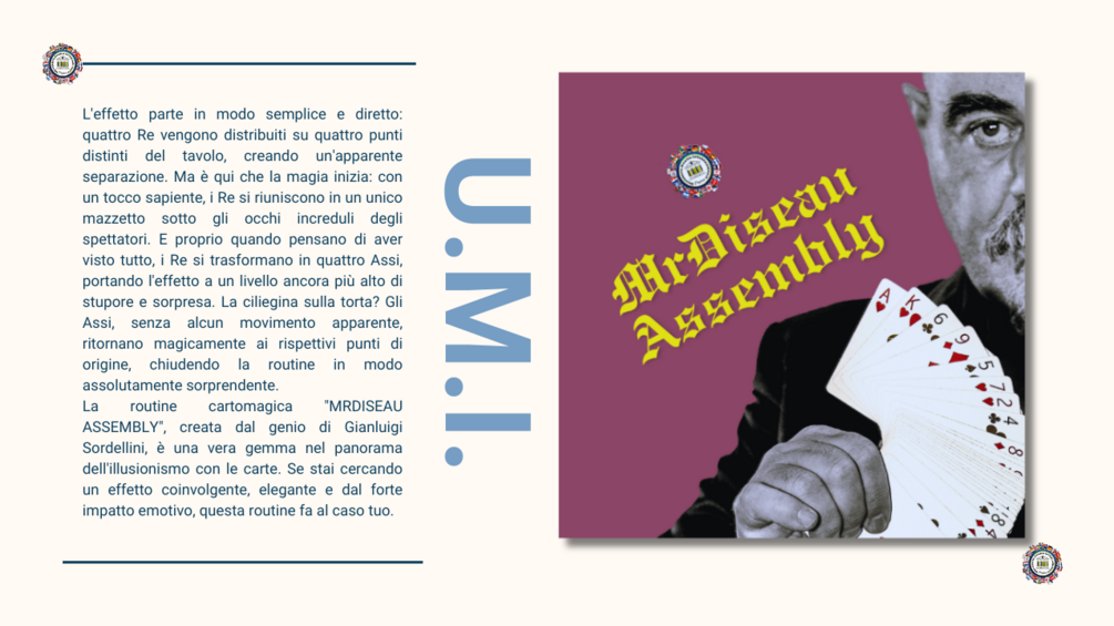 La routine cartomagica "MRDISEAU ASSEMBLY", creata dal genio di Gianluigi Sordellini, è una vera gemma nel panorama dell'illusionismo con le carte. Se stai cercando un effetto coinvolgente, elegante e dal forte impatto emotivo, questa routine fa al caso tuo.