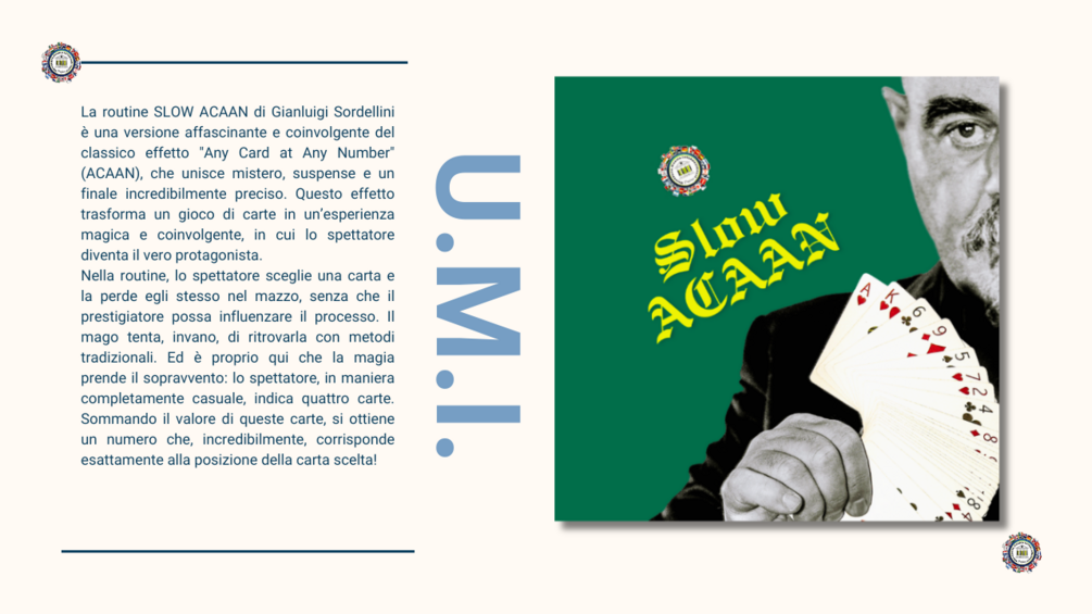 La routine SLOW ACAAN di Gianluigi Sordellini è una versione affascinante e coinvolgente del classico effetto "Any Card at Any Number" (ACAAN), che unisce mistero, suspense e un finale incredibilmente preciso. Questo effetto trasforma un gioco di carte in un’esperienza magica e coinvolgente, in cui lo spettatore diventa il vero protagonista.
