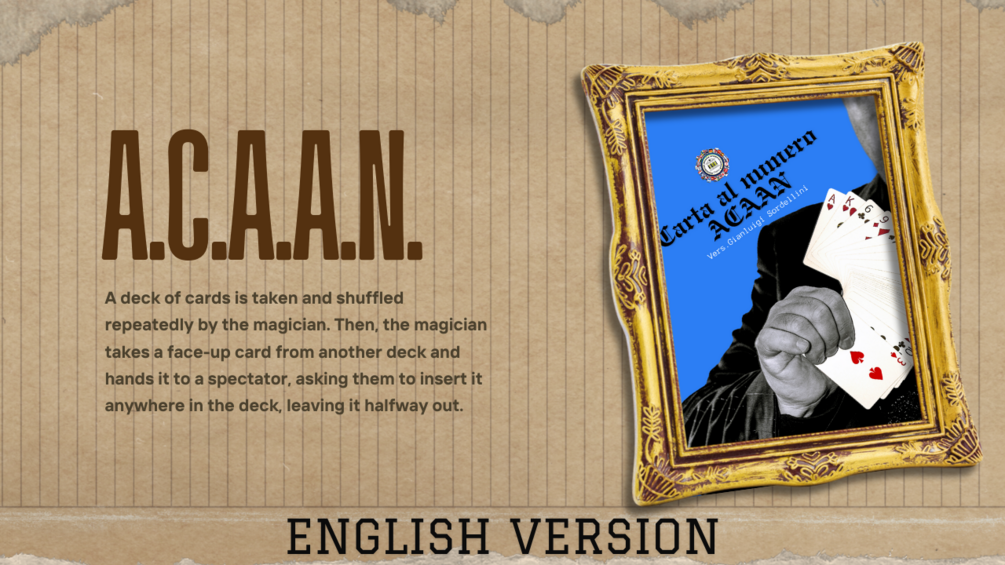 From a deck of cards, the spectator selects a card and then loses it in the deck without showing it to anyone. The performer takes another deck of cards, shuffles it, and shows that each card is in a random position. He notices two twin cards in the center. Taking advantage of this, he says it's a sign of fate and that he will use the twin cards to find the selected card, even though he doesn't know what it is. He shuffles the deck again, and magically, the pair of twin cards capture a card, which turns out to be the twin of the chosen one. Undeterred, the performer adds the value of the twin cards plus the captured card, and by counting down from the top of the deck to the resulting number, he arrives at the card selected by the spectator.
